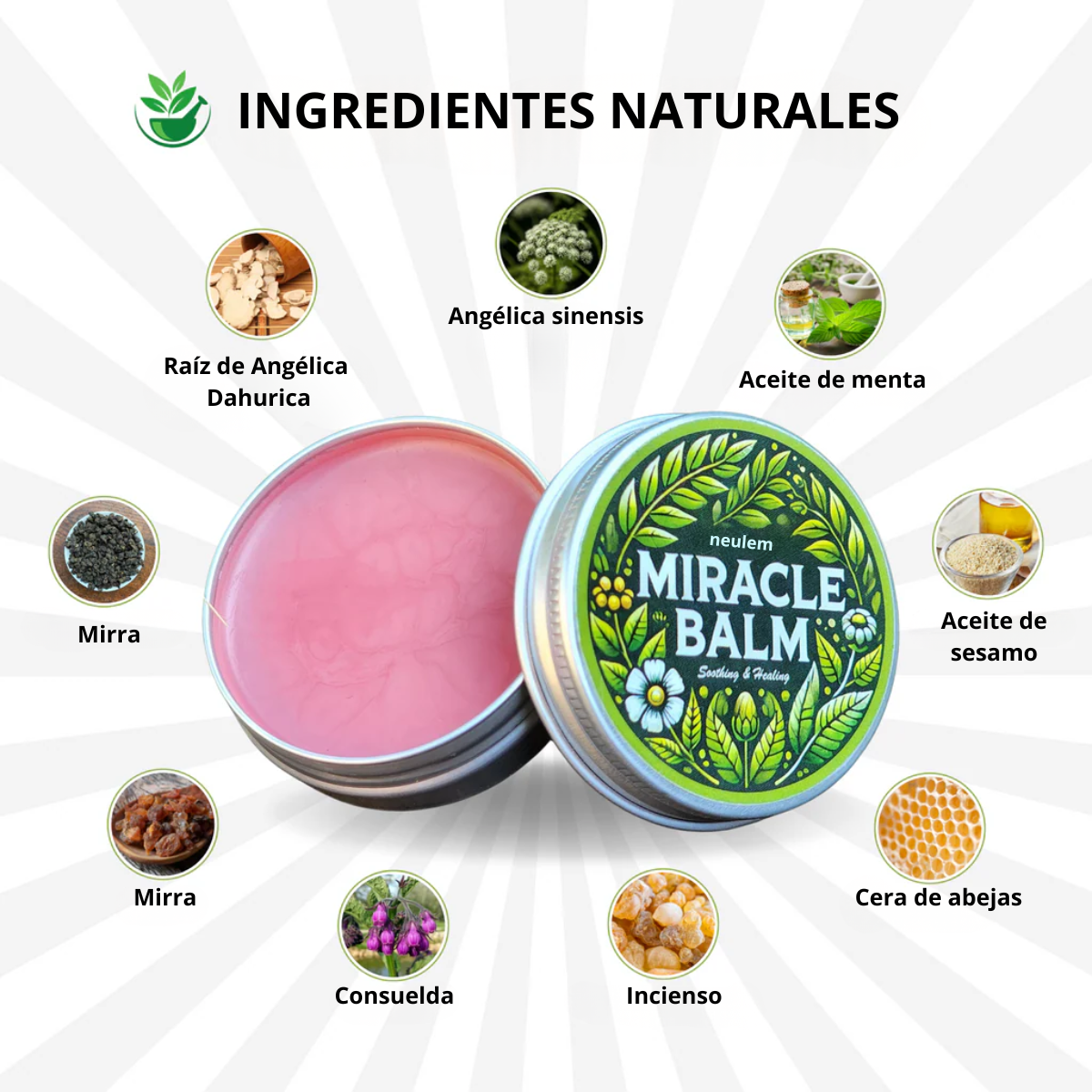 Cada hierba es elegida para calmar nervios irritados, restaurar la circulación, y ayudar a la reparación natural. A diferencia de otras marcas rebajadas con agua, Neulem Miracle Balm usa solo extractos naturales.